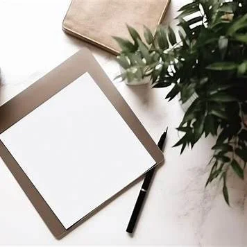A tablet with a blank white screen, a black pen, a closed notebook, and a plant on a white surface.